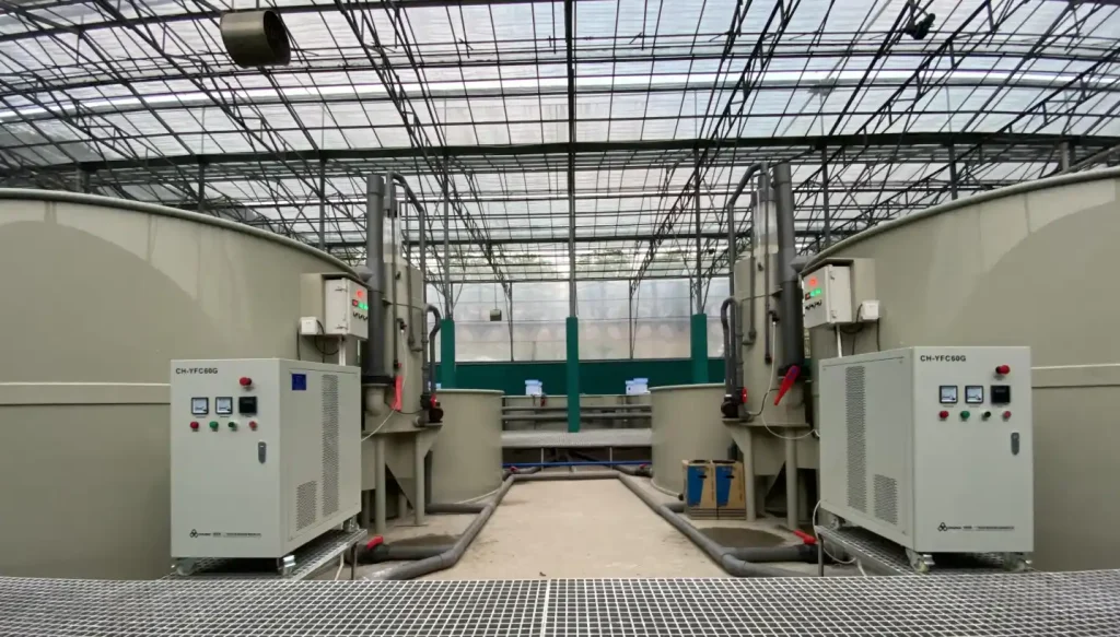 位于广州南沙的工厂化笋壳鱼养殖基地,整个基地养殖池36个,每个直径9米,养殖面积1000㎡左右。养殖原水为珠江口浅层地表水,属于咸淡水(海水和淡水交融),经水质检测水中重金属含量超标。